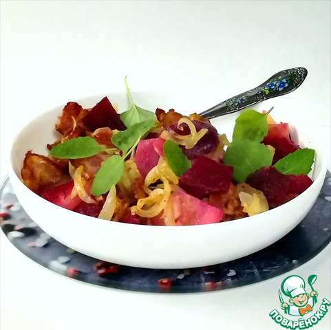 Смешать картофель, свеклу и жареные бекон с луком, добавить 1 столовую ложку оливкового масла. Попробовать на вкус, если надо, посолить/поперчить или добавить уксус. Если есть время, можно остудить хотя бы 15 минут, но и тёплый салат вкусный.