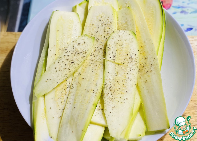 Кабачок/цуккини нарезать на тонкие пластины, добавить соль, перец душистый, перемешать, отставить в сторону