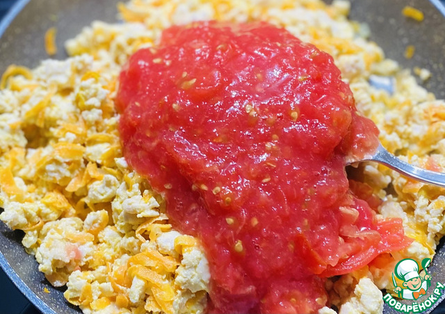- Томаты в собственном соку (у меня свежие помидоры натерла на терке без кожи) — 400 мл