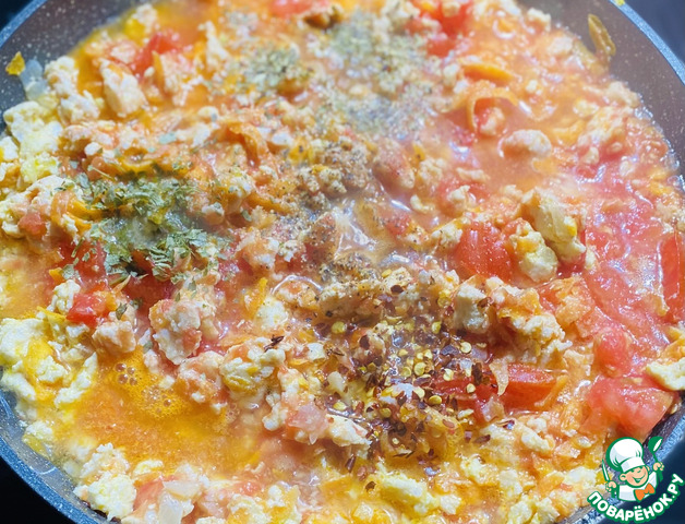 Свежие травы нарезать добавить, у меня сухие травы, для остроты я добавила хлопья острого перца Чили,