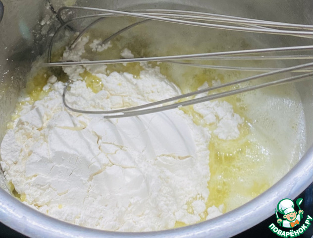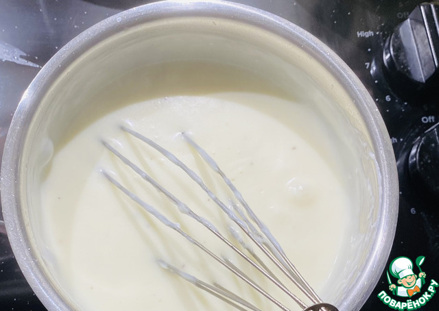Для соуса Бешамель, растопить сливочное масло в сотейнике, добавить муку, хорошо помешивать венчиком чтобы не пригорело