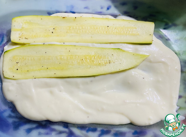 1)На дно формы 17-25 налить немного соуса, распределить по дну формы, выложить нарезанные кабачок/цуккини. Духовку включить!