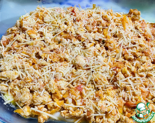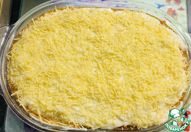 Сверху посыпать сыром. Поставить в духовку на 180 "-200" в течении 30-40 минут до золотистой корочки.