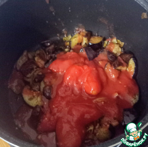 В большой ёмкости соединить баклажан, луковую смесь и добавить томаты. Готовить 4 минуты на медленном огне.
