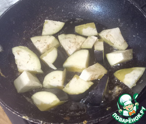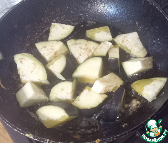 - Баклажан (крупный, нарезанный на кубики по 3 см каждый) — 1 шт