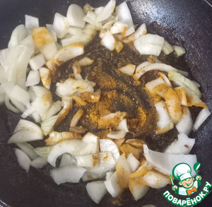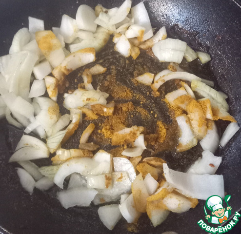 В той же сковороде разогреть 1 столовую ложку масла и готовить лук, половину карри порошка, кардамон и 1 чайную ложку соли в течение 10 минут до мягкости лука.