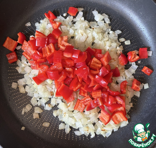 На разогретом оливковом масле обжарить минут пять лук, добавить чеснок, минуты через две добавить сладкий перец, обжаривать минут пять.