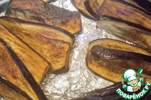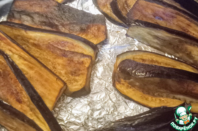 Разогреть духовку до 220С в режиме гриль. На пекарскую бумагу или фольгу выложить баклажаны, обвалять их в подсолнечном масле до полного покрытия и готовить в духовке 25 минут.