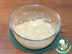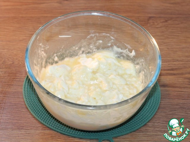 • 2. Смешиваем продукты: творог, яйцо, сметану, мягкое масло, сахар и соль. Взбиваем венчиком. Творог лучше протереть через сито.
