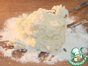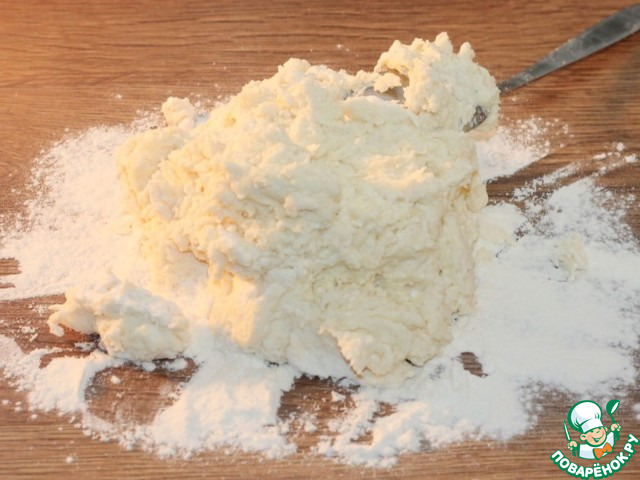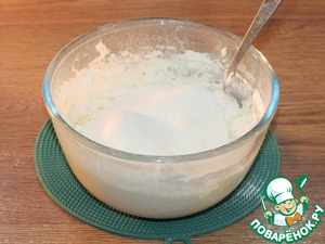 • 4. Небольшими частями просеиваем мучную смесь в миску с творожной смесью. Вначале замешиваем ложкой.