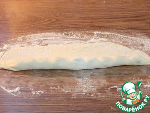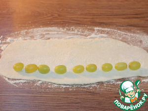 • 9. Раскатываем каждый шарик в длинную и тонкую лепешку (толщ. 1-2 мм). Посыпаем сахаром и раскладываем цепочкой виноград.