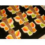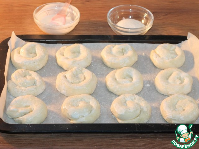 • 13. Застилаем противень пекарской бумагой и смазываем ее холодным сливочным маслом. Раскладываем на противне заготовки печенья и смазываем жидкой сметаной (1 ст. л. сметаны+1 ст. л. воды).