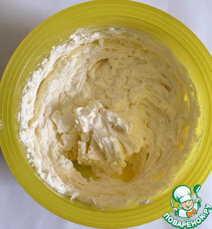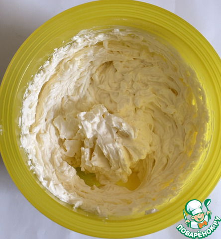 Для крема я взбила 300 г. творожного сыра, 100 мл. сливок 33 % и 70 г. сахарной пудры.