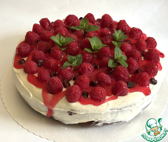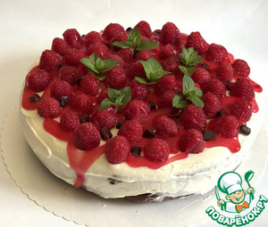 Обмазала пирог кремом со всех сторон и украсила свежей малиной и листиками мяты.