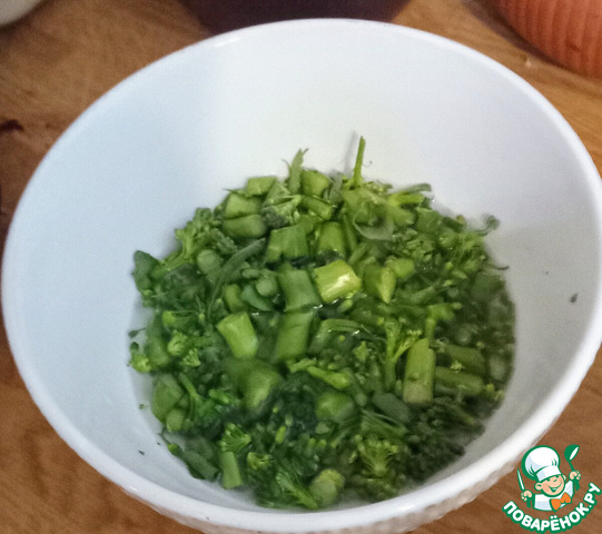 Под кипятком бланшировать брокколетти 2 минуты. Процедить. Выложить в салатницу.