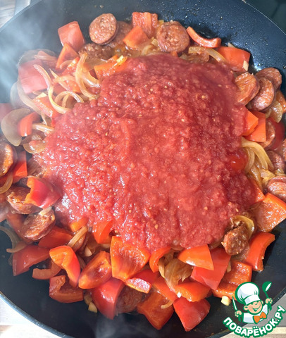 Добавить болгарский перец, обжарить всё вместе ещё минут пять, влить пассерованные томаты, посолить/поперчить, довести до кипения и потушить пару минут для соединения вкуса. С солью и перцем осторожно, колбаса уже солёная и острая.