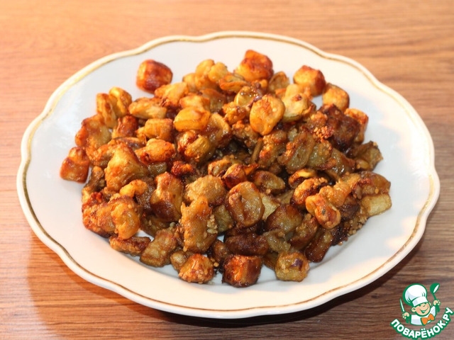 • 7. На хорошо разогретом растительном масле, небольшими порциями, обжариваем дольки баклажан с двух сторон, минут 5.