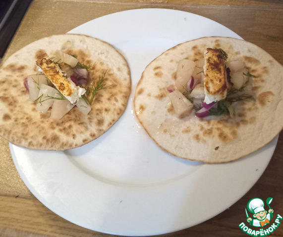 На такос выложить начала ананасную сальсу, а затем нарезанный на кусочки запеченный сыр Фета. Приятного аппетита