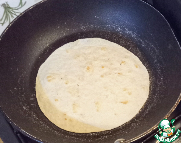 На сухой сковороде жарить такос по 30 секунд с каждой стороны до румяности.