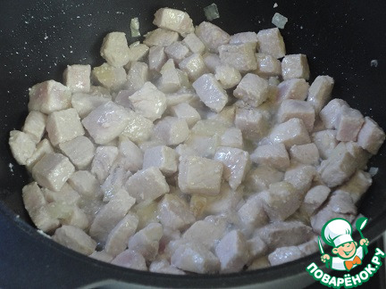 Добавить к луку мясо и тушить все вместе, помешивая, пока мясо полностью не изменит цвет.