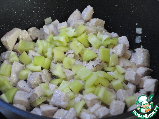 Помидор очистить от кожицы и также нарезать кубиками. Мясо нарезать кусочками.