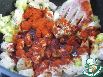 Снять мясо на минуту с огня. Это делается перед добавлением паприки. Важно следить, чтобы паприка не попала на горячую поверхность посуды, в которой готовите, и не подгорела, ведь она тогда придаст блюду горечь. Добавьте тмин и паприку, хорошо перемешайте, чтобы она хорошо прогрелась от тепла продуктов, которые уже тушились или жарились. Паприка лучше раскрывает свой аромат при «нежном» нагревании.