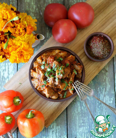 Добавьте помидор, соль по вкусу и долейте столько воды, чтобы мясо было покрыто полностью. Поставьте кастрюлю с мясом на средний огонь, доведите до кипения, убавьте огонь до минимума и тушите, неплотно прикрыв крышкой, примерно 1,5–2 часа, периодически перемешивая. Большинство жидкости должно испариться, а мясо должно быть очень мягким.