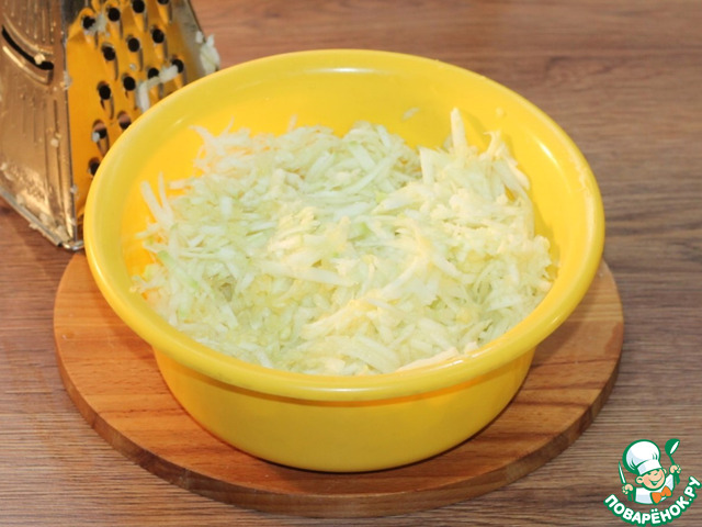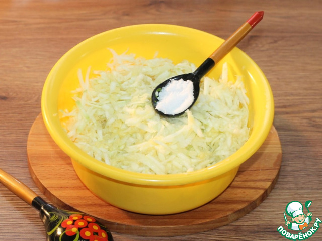 3. Кабачковую массу посыпаем солью (1 ч. л.) и оставляем до выделения сока, минут на 10.