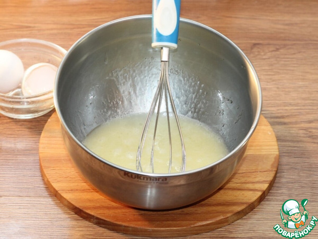 4. Вбиваем в миску 2 куриных яйца. Добавляем сахар (1 ст. л.) и вливаем растительное масло (100 мл), взбиваем венчиком до бела.