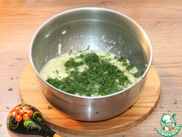 6. Укроп мелко нарезаем, немного отжимаем до выделения сока. Сыр натираем на крупной терке. Добавляем укроп и сыр в миску.