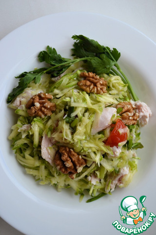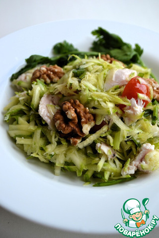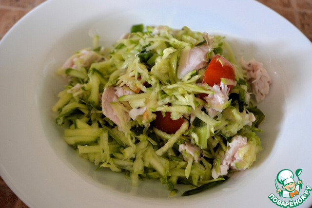 Сытный и вкусный салат, который отлично подойдет как для повседневного ужина, так и для праздничного стола. Нежное куриное мясо в сочетании со свежими кабачками, сочными помидорками черри и ароматной зеленью создают гармоничное блюдо с насыщенным вкусом.