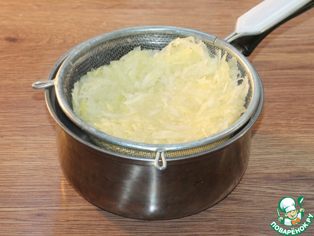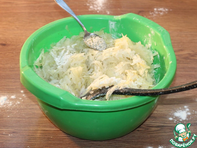 9. Отжимаем картофель руками, убирая лишнюю воду. В миску с картофелем добавляем тертый лук, вбиваем 1 яйцо и 1 куриный желток. Всыпаем специи. Специи - это соль, перец, сухие лук, чеснок и пряные травы. Все это перемешиваем.