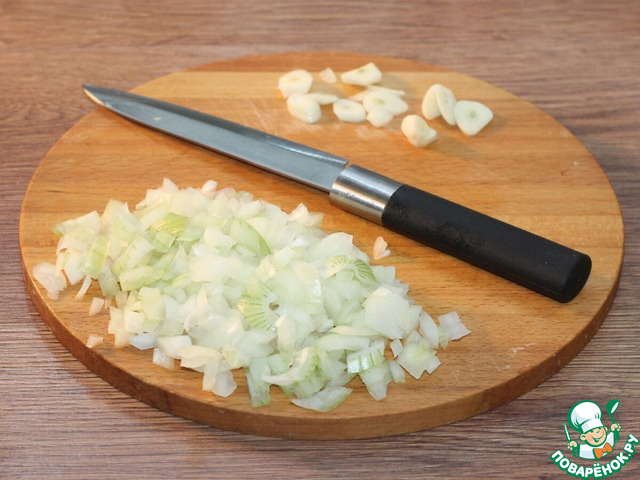 7. Вторую луковицу нарезаем маленькими кубиками, чеснок - дольками.