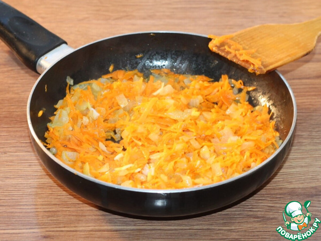 8. На разогретом растительном масле (2-3 ст. л.) обжариваем чеснок до выделения аромата. Затем чеснок удаляем. На чесночном масле обжариваем лук, минуты 3. Добавляем морковь и продолжаем тушить еще 3 минуты.