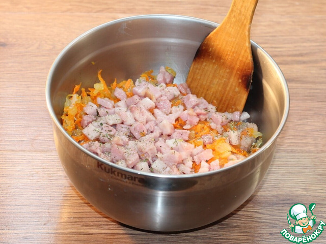 10. Грудинку нарезаем маленькими кубиками и обжариваем на минимальном количестве растительного масла. У меня грудинка с хорошим жирком. К куриному фаршу добавляем пассеровку, обжаренную грудинку, 1 куриный белок и специи, перемешиваем.