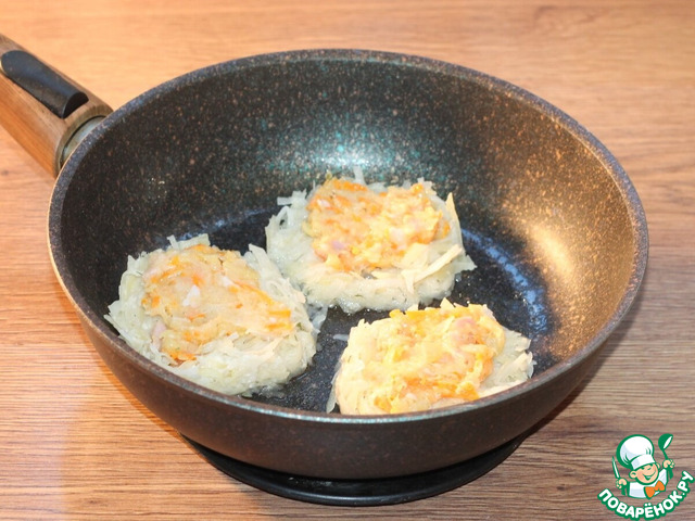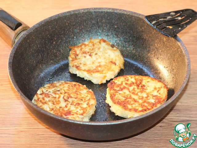 11. Разогреваем растительное масло (1 ст. л.) и раскладываем картофель (по 2 ст. л.), формируем не очень толстые лепешки (см видео). Сразу же сверху кладем по 1 ст. л. фарша.
