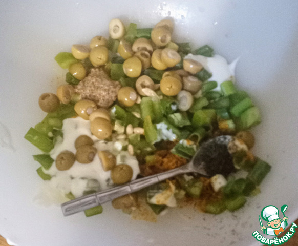 - Оливки зеленые (можно заменить каперсами или солёными огурцами, нарезанные) — 2 ст. л.
