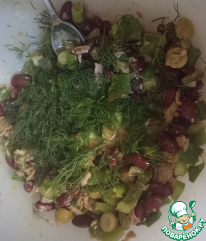 Посыпьте сухим укропом. Добавьте любимую зелень. У меня это свежий укроп. Загрузите фасоль.