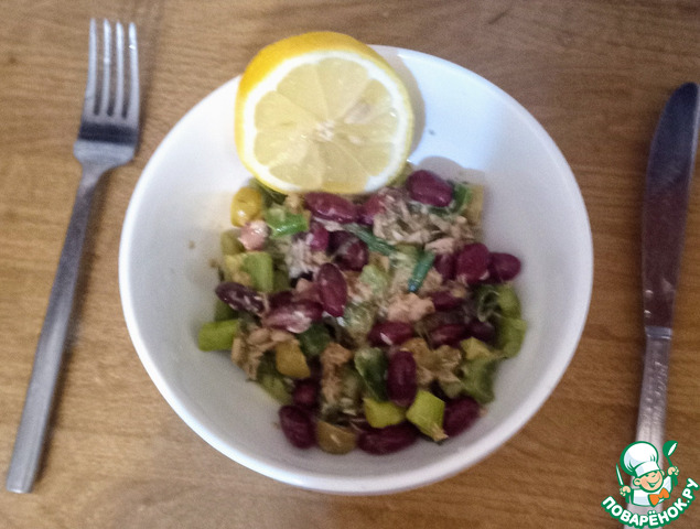 Предлагается старое блюдо английской кухни, которое было популярно в 70-е годы прошлого века и представляло собой сочетание тунца и фасоли с различными добавками. Подавалось блюдо в двух видах : как салат, со множеством овощей, количество и состав которых варьировались - я их перечисляю как опциональные, а также в более холодные дни как закуска внутри печеного картофеля, давая возможность тунцу расплавиться.