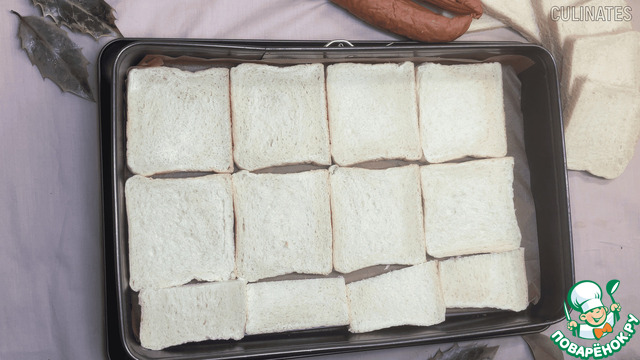 Застелите противень бумагой для выпечки и выложите на него ломтики хлеба в один слой.