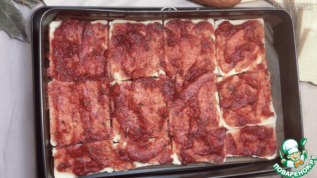 В небольшой миске смешайте томатную пасту с солью, перцем, орегано и базиликом. Смажьте каждый ломтик хлеба томатным соусом.