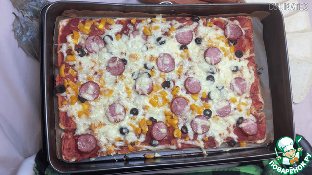 Сверху выложите колбасу, болгарский перец, оливки, а затем посыпьте всё тёртым сыром.