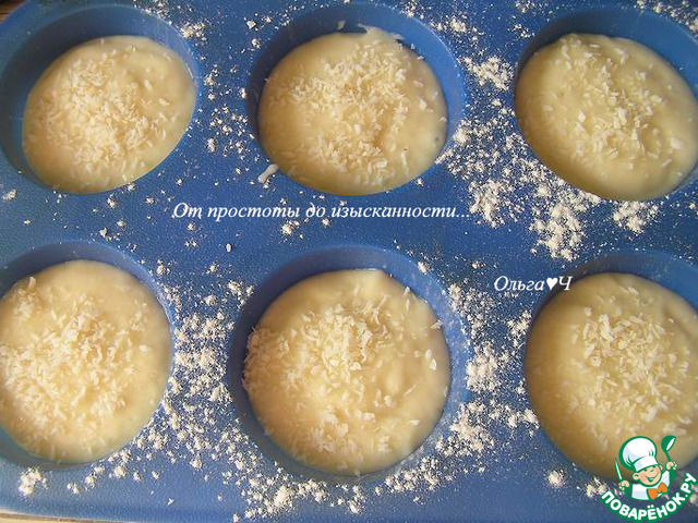 • Тесто разложите по 6-9 формочкам, смазанным маслом и присыпанным мукой (по желанию выложите в бумажные формочки для кексов). Сверху посыпьте кокосовой стружкой.
