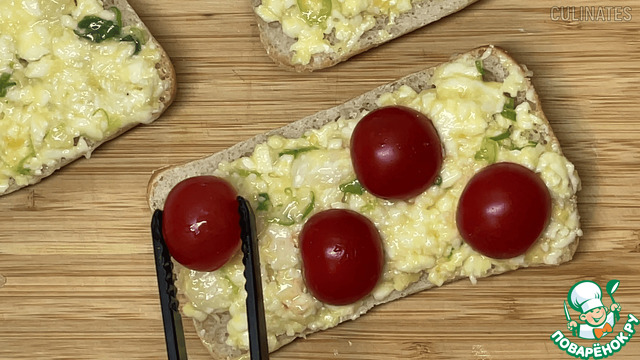 Намажьте на хлеб, выложите помидоры нарезанные на половинки, посыпьте тмином и запекайте в духовке 10–15 минут.
