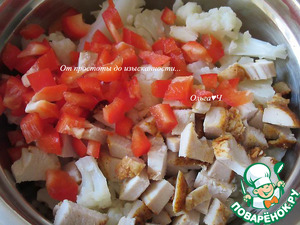 Добавьте нарезанный сладкий перец и куриное филе.