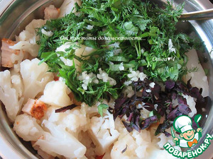 Всыпьте рубленную зелень (укроп, петрушку, базилик) и измельченный чеснок.