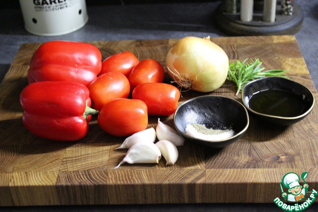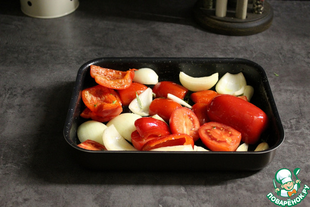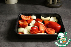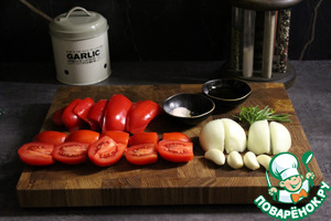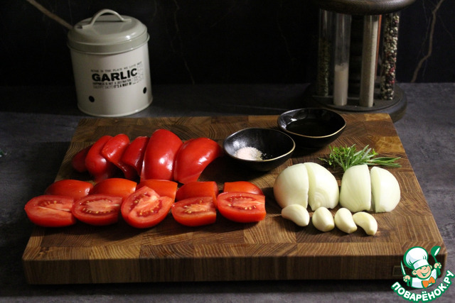 Нарезать пополам помидоры, сладкий перец, лук и три зубчика чеснока.