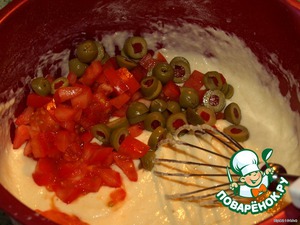 • Все смешать и добавить оливки с помидорами. Отставить тесто на 15-20 минут для набухания манки.