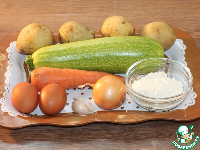 3. Овощи очищаем. Кабачок (сок из кабачка не отжимаем), уже вареный картофель и морковь, натираем на крупной терке...