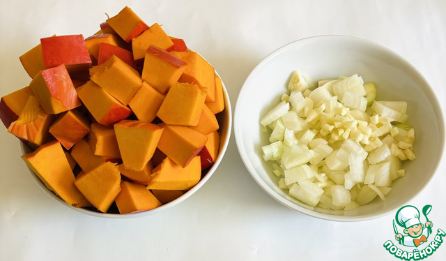 Тыкву нарезать кубиками, так же лук и чеснок.